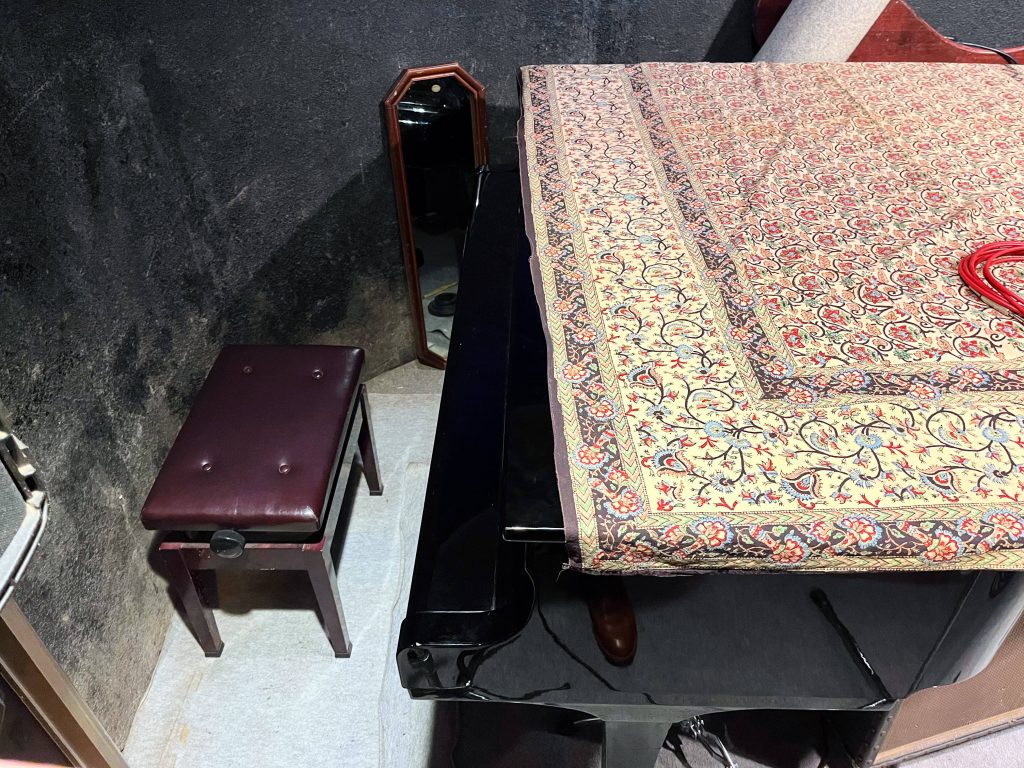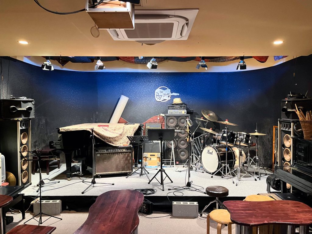 グランドピアノがステージ上へ移設されました。それに伴いドラムセットが上手に。ドラマーのお顔もはっきり見えるセッティング。