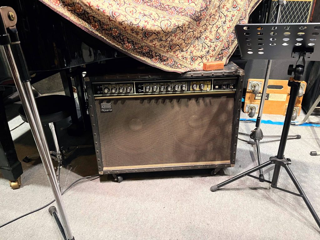 これらのギター類は自由に使用してOKとのこと。右端のエレアコは使えそうな気が(しらんけど)